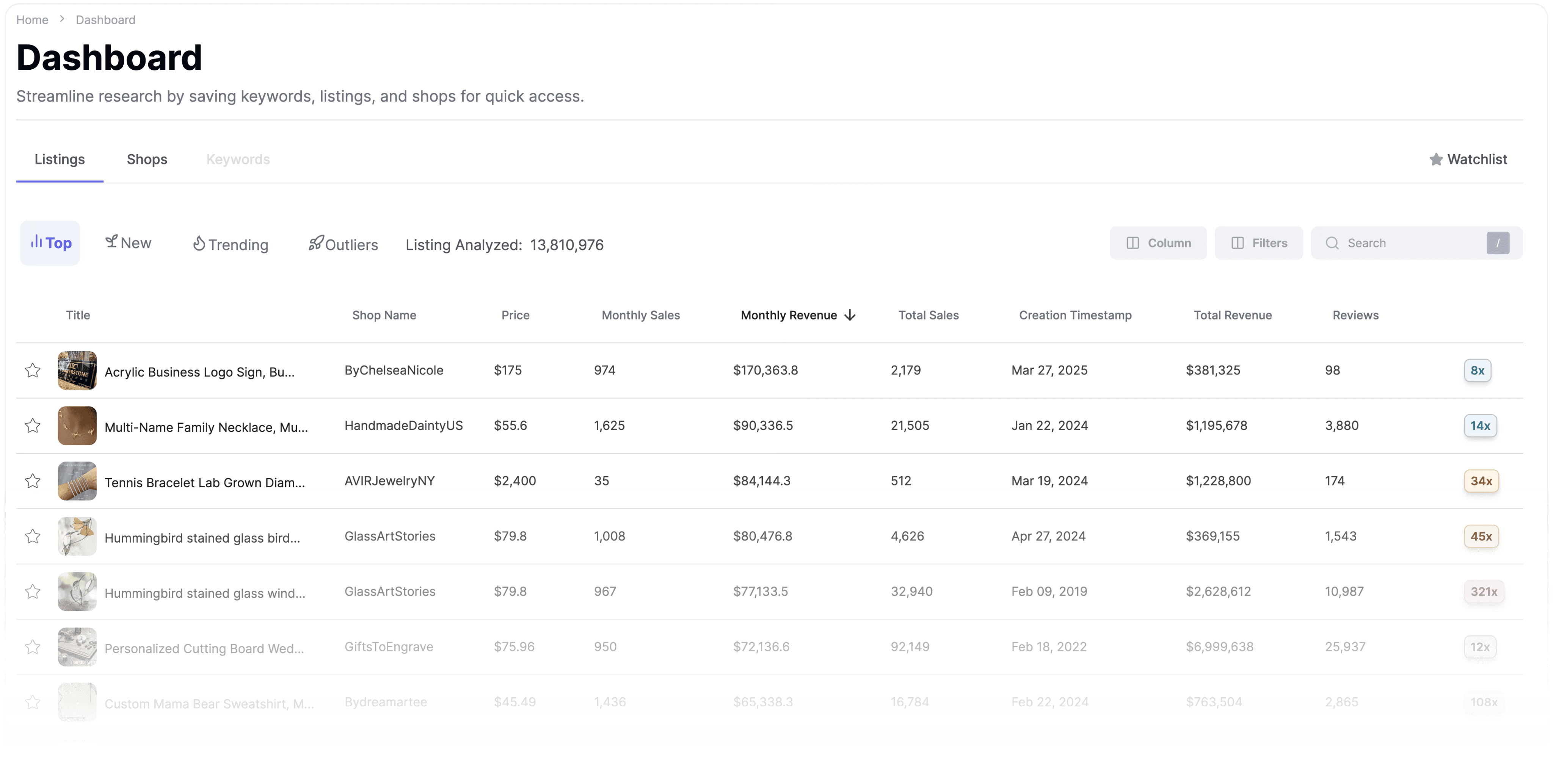 You can do this manually by clicking into each shop, but ListingView's Shops tool speeds this up significantly. Search for any Etsy shop and get a breakdown of their performance — including which of their listings are driving the most sales. Instead of clicking through dozens of products one at a time, you can see the data in one view.